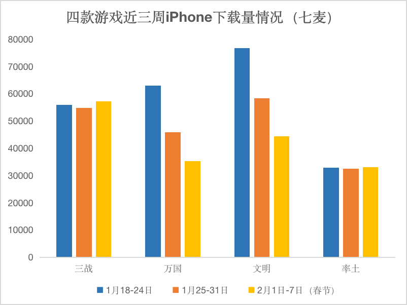 从总下载量看: 阿里《三国志·战略版》在下载量领先,春节期间也交出了出色的成绩单,依然属于国内SLG标杆;值得注意的是,去年末才上线的《文明与征服》近三周合计下载量与《三战》基本并驾齐驱!可谓“后生可畏”。
