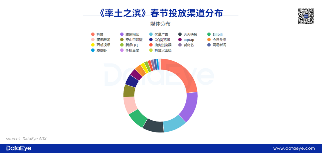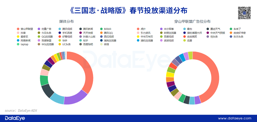 从投放渠道来看:突出投放范围广、针对性强两个特点。 以投放量较高的《三国志·战略版》为例,春节假期投放渠道25个,穿山甲联盟比重较高,其次为优量广告和腾讯视频。《率土之滨》则以抖音作为主要投放渠道,腾讯视频和优量广告同样占据较高的投放占比。
