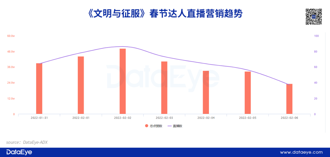 根据DataEye-ADX达人营销数据显示, 《文明与征服》在春节档却保持了较高的达人直播数量,春节档期间共直播超过400场,成为国内达人直播营销榜第一。 数据统计显示,整个春节期间直播总点赞数约为262.3W,但最高在线人数仅有1.9W人次。