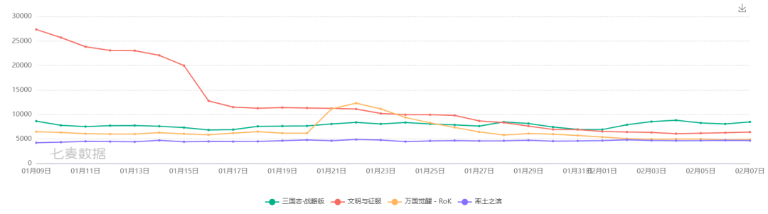 莉莉丝的《万国觉醒》在1月下旬完成版本更新,下载量迎来一波“小高潮”,后续下载量回到正常水平。但不可否认,《万国觉醒》无法与两位大哥相比拟,面对高调上线的《文明与征服》,遭遇战的准备略显不足。根据七麦数据显示,《万国觉醒》已经跌出畅销榜TOP30,目前排名第36名。