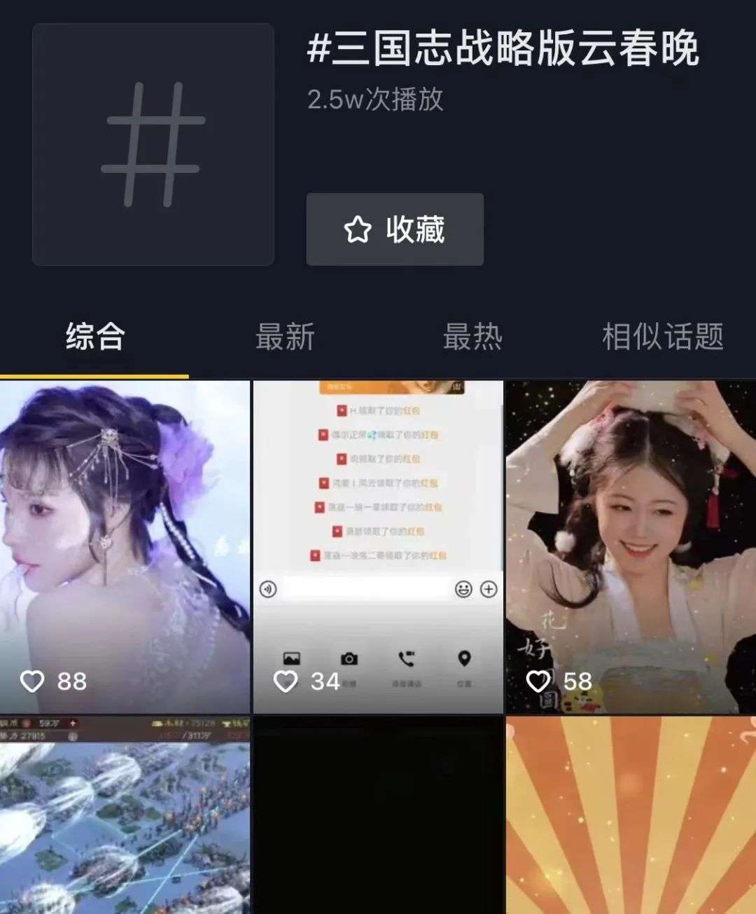 同时在抖音平台发起#三国志战略版云春晚 话题,试图让更多用户通过抖音平台了解游戏内容以及游戏文化。但观察发现,整体播放量并不理想,话题播放量仅为2.5W次。