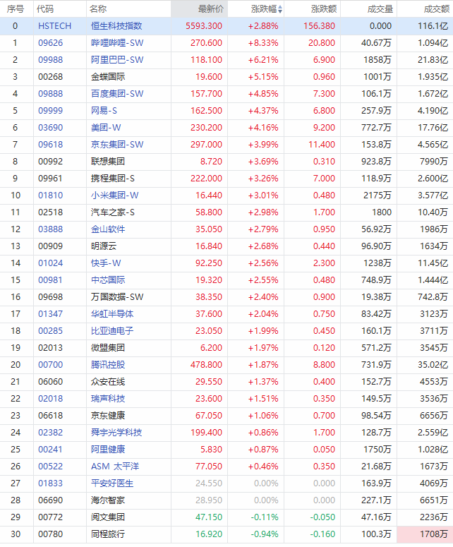 阿里巴巴涨超6%;百度集团、网易、美团等涨超4%;京东集团、小米集团涨超3%;中芯国际、快手涨超2%;腾讯控股涨逾1%。