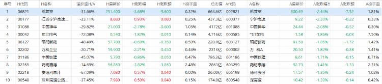 凯莱英A股跌2.44%,H股跌3.68%;中国神华A股跌2.08%,H股跌2.78%。