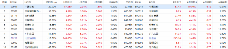 截至发稿,中国移动A股涨停,H股涨2.84%;华能国际电力A股涨6.19%,H股涨3.8%;兖矿能源A股涨5.02%,H股涨1.58%。