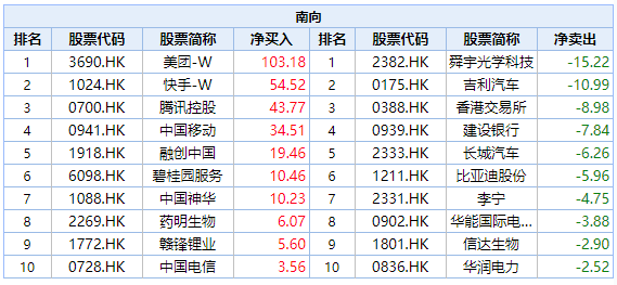 其中,近一个月以来,美团-W $03690.HK 的净买入额为103.18亿港元,快手-W $01024.HK 的净买入额为54.52亿港元,腾讯控股 $00700.HK 的净买入额为43.77亿港元,融创中国、碧桂园服务、中国神华等也获得南向资金增持超10亿港元。