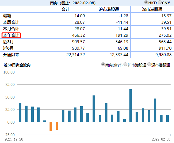 数据显示,港股开年以来不断获南下资金增持,截至2月8日,南向资金连续18个交易日呈净买入态势,今年累计净买入466.32亿港元。