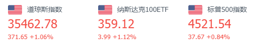 美股三大指数集体收涨,截至收盘,道指上涨1.06%,报35462.78点;纳指涨幅达1.28%,报14194.50点;标普500指数上涨0.84%,报4521.54点。