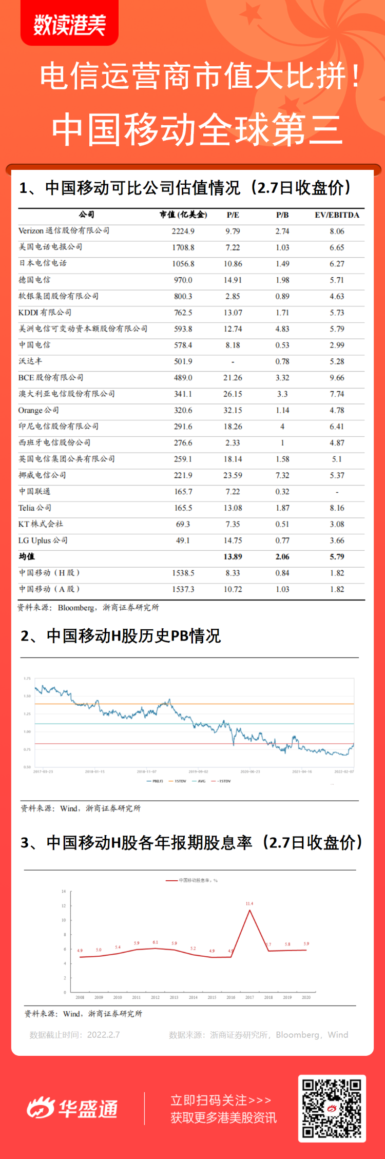 截至2月7日,全球电信运营商市值排名如下,第一的是Verizon,第二则是AT&T,第三为中国移动。