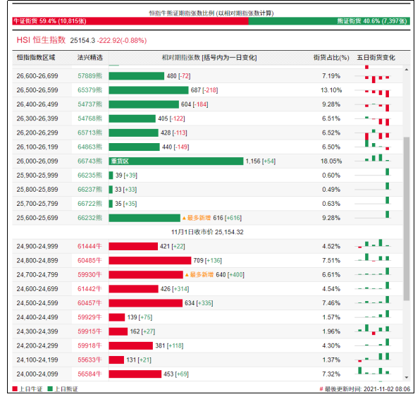 街货分布方面,至周一,恒指牛证街货贴价区间主要在收回价24500点至25000点之间,累计相当约2830张期指合约;恒指熊证街货在收回价26000点至26400点,累计相当约3033张期指合约。