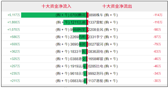 好仓(认购证及牛证)方面,周一腾讯、比迪相关好仓单日分别录得约5117万、1808万港元资金净流入;相反,株车、雷蛇等相关好仓单日有少量资金净流出。