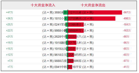 淡仓(认沽证及熊证)方面,周一美团、小米相关淡仓单日分别录得约47万、36万港元资金净流入;相反,比迪、腾讯相关淡仓单日分别录得约567万港元、498万港元资金净流出。