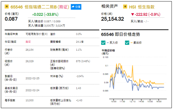 1、强势轮证:恒指瑞通二二熊B(65546.HK),周一大幅上涨33.8%;
