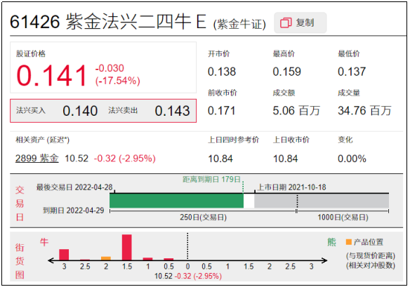 2、看错方向:紫金法兴二四牛E(61426.HK),周一下跌17.54%。