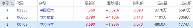 华盛资讯2月10日讯,“恒大系”集体走高,截至发稿,中国恒大涨5.39%,现报1.76港元每股;恒大物业涨4.1%,报2.79港元每股;恒大汽车涨近2%,报3.69港元每股。