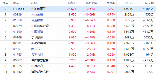 华西证券的最新点评报告也强调,一方面高教板块业绩持续稳健,另一方面,国家加快推进职业本科工作落地,民办本科学校有望受益,继续推荐中教控股、希望教育、新高教集团、中汇教育、中国科培等。