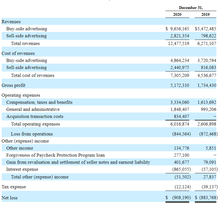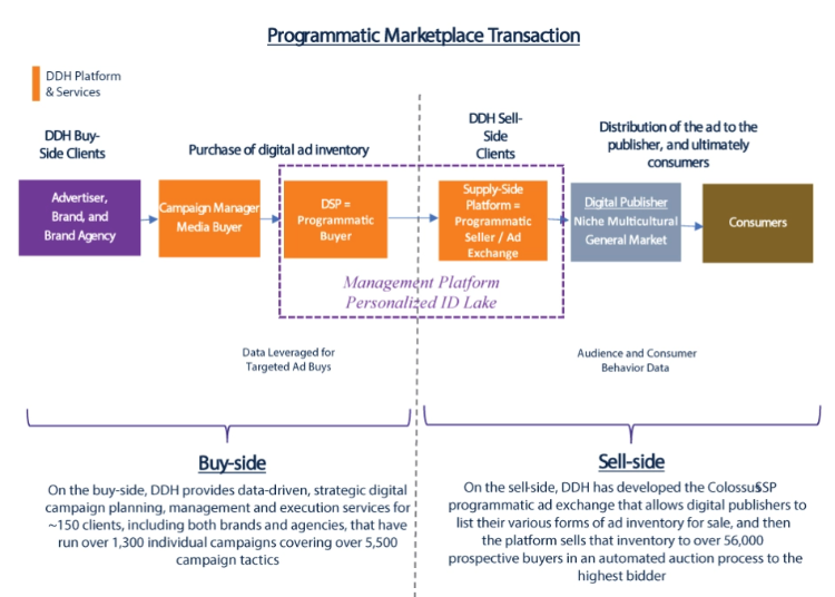 具体业务中,Colossus Media经营Direct Digital Holdings的卖方程序化平台(即销售),Huddled Masses则主营公司业务的买方平台。此外,Direct Digital Holdings在2020年收购了Orange142, LLC,以巩固公司整体程序化买方广告平台,并特别强调了协助中小型企业(公司在招股书中定义为收入在500万至5亿美元之间的公司)向数字化过渡。