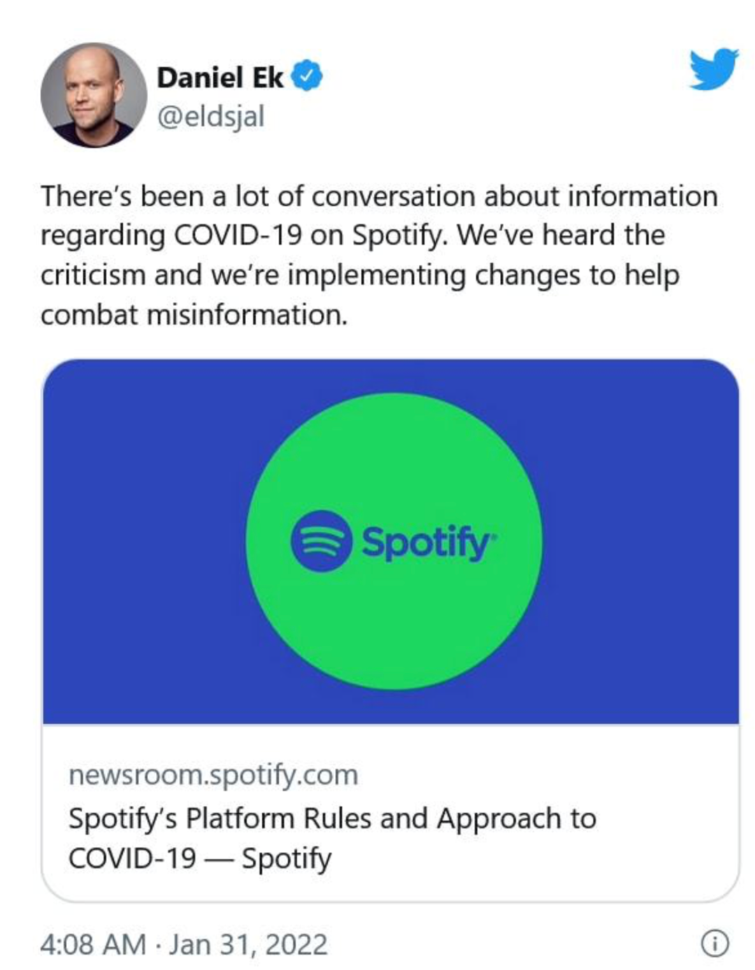 最近,乔·罗根在播客中的言论就陷入了争议的旋涡。包括几十位医学和科学专业人士在内的批评者认为,Spotify应该处理罗根播客中关于新冠病毒明显的错误信息,像建议健康的年轻成年人不需要接种疫苗之类的言论。