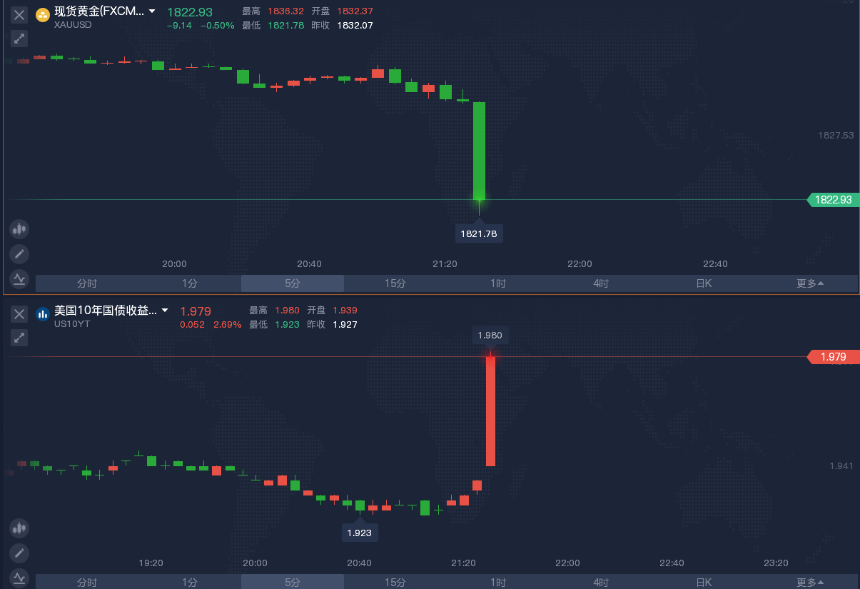 数据公布后,现货黄金短线走低4美元,现报1826.14美元/盎司。COMEX最活跃黄金期货合约北京时间2月10日21:30一分钟内买卖盘面瞬间成交5006手,交易合约总价值9.13亿美元。美元指数短线走高逾20点,报95.76。