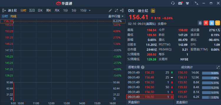 华盛资讯2月10日消息,美股盘初,迪士尼、优步逆市走高。截止发稿,迪士尼 $DIS 涨超6%,优步 $UBER 涨超4%,两家公司此前公布了最新财报。