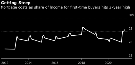 美国全国地产经纪商协会(NAR)称,对于首次购房者而言,第四季度按揭贷款的月供占家庭收入的比重跃升至25.6%,可负担能力为三年来最差。去年同期这一比例为22.4%。