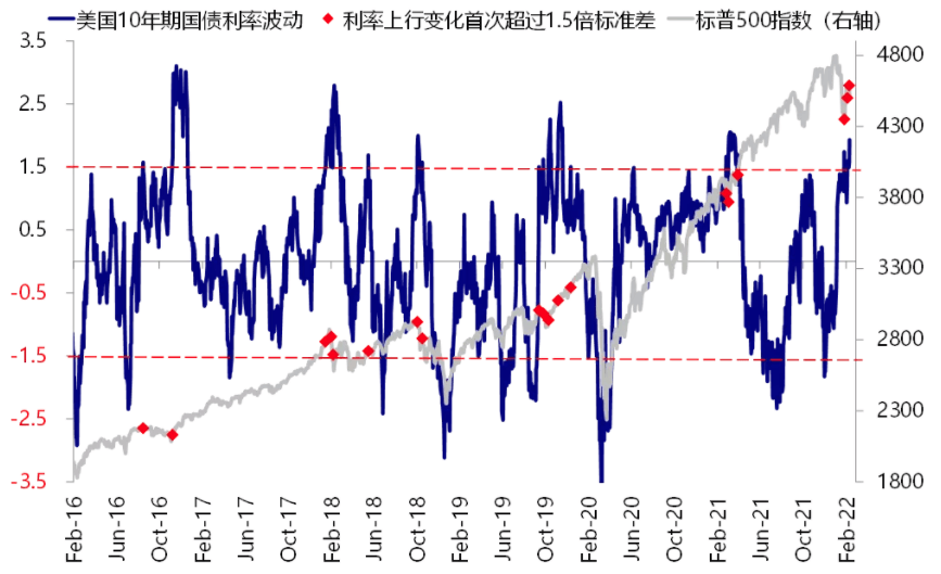 从幅度上,根据两者的历史相关性测算,2年期国债上行从去年底上行120bp基本对应15%的估值回调,而同期标普500指数的估值回调幅度为~11%。