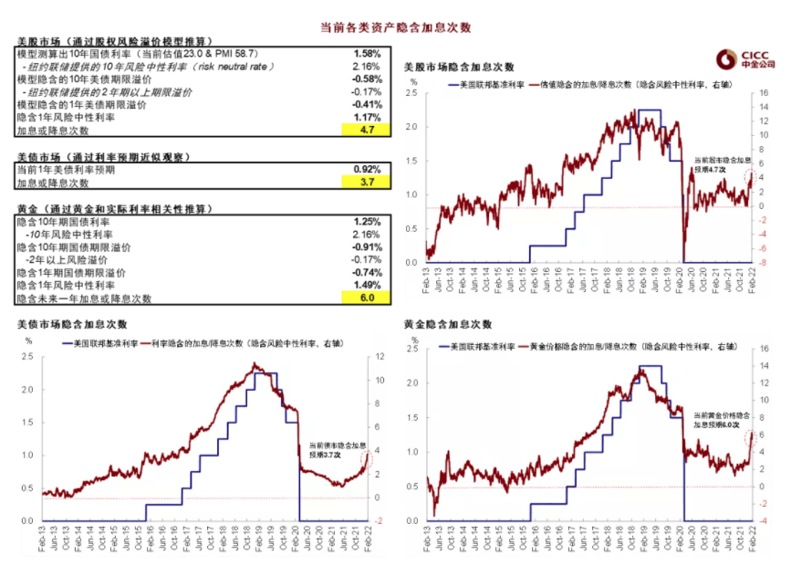 根据我们的模型测算,美股、美债和黄金分别计入的全年加息次数预期分别约为5次、4次和6次,与昨天因通胀数据抬升后的水平基本一致。