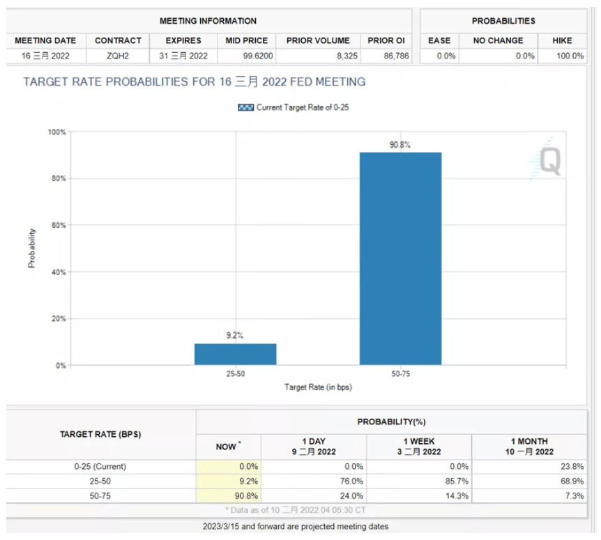 1)CME利率期货隐含的3月加息50bp的预期直接跃升至90%以上,数据公布前不到30%。全年的加息步伐也提升至175bp,对应一次25bp的话为7次。