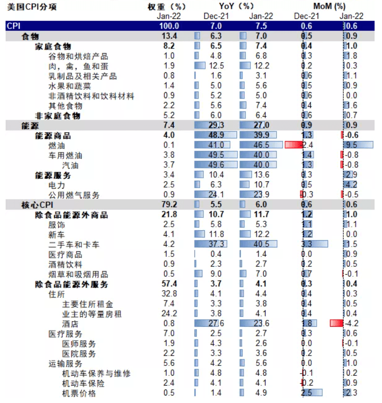 美国1月CPI同比抬升7.5%(vs. 12月7%),超出预期的7.3%;环比0.6%,也高于预期。分项来看,食品(环比0.9% vs. 12月0.5%),燃油和电力的环比涨幅较大。