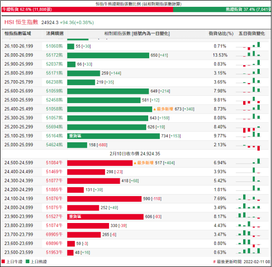 街货分布方面,至周四,恒指牛证街货重货区在收回价23700点至24200点之间,累计相当约2,043张期指合约;恒指熊证街货重货区在收回价25100点至25500点之间,累计相当约2,676张期指合约。