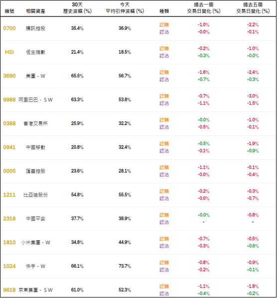 周四恒指相关权证的平均引伸波幅约18.5%,按日略有调降。个股方面,腾讯控股、阿里巴巴、汇丰控股、比亚迪股份、小米集团及快手等相关认购证及认沽证的引申波幅按日均有所调降。