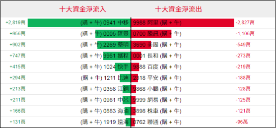 好仓(认购证及牛证)方面,周四中移相关好仓单日录得约2,819万港元资金净流入,汇丰、药明、携程及快手等相关好仓亦见部分资金净流入;相反,阿里相关好仓单日录得约2,827万港元资金净流出,腾讯、美团、长和等相关好仓单日亦录得部分资金净流出。