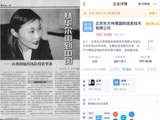 1997年,谷燕顶着华尔街精英的名头,回国创业,但时隔五年之后,2002年1月,那家名为“东方伟博”的公司,就被匆匆注销。
