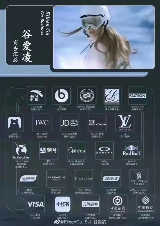 谷爱凌夺冠那天上午,有位品牌商发给张志鹏了一张图片,列举了谷爱凌的20多个代言——覆盖消费品、互联网、金融、建材等多个行业。