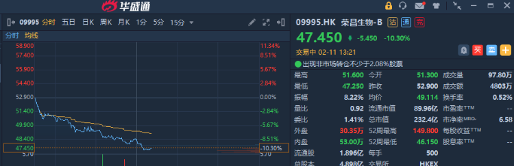 荣昌生物-B(09995.HK)截至发稿下跌10.30%,现报47.45港元,跌5.45港元。成交97万股,涉资4803万元。