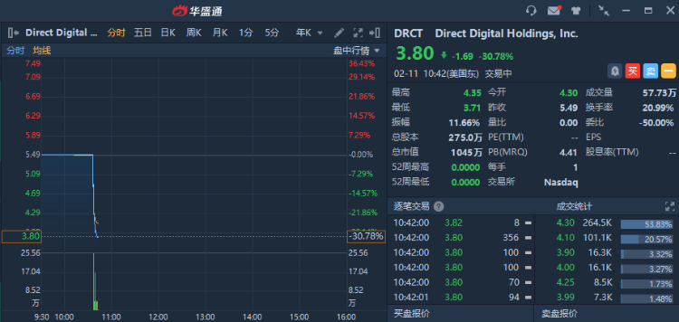 华盛资讯2月11日消息,美国广告科技平台Direct Digital Holdings登陆纳斯达克,开盘跌近31%,股价报3.8美元。