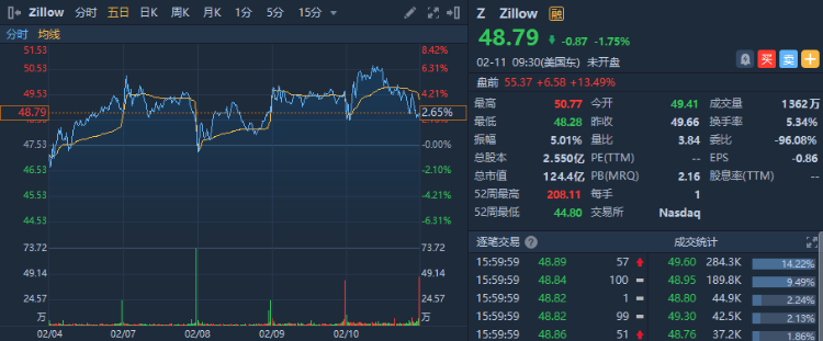 Zillow涨超13%,Q4业绩超出预期,Zillow Offers部门营收同比大幅增长至33.4亿美元。