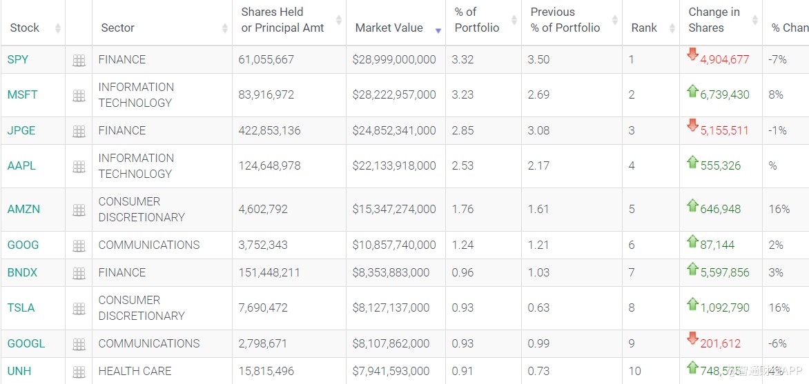 苹果、亚马逊分别列四、五位,持仓市值分别为221.34亿美元和153.47亿美元,占投资组合比例分别为2.53%、1.76%。