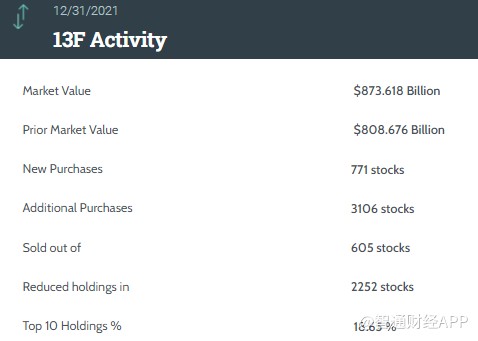 据统计,小摩四季度持仓总市值为8736.18亿美元,上一季度总市值为8086.76亿美元,环比上涨8%。小摩在四季度的持仓组合中新增了771只个股,增持了3106 只个股。同时,小摩还减持了2252 只个股并清仓了605只个股。其中前十大持仓标的占总市值的18.65%。