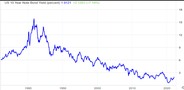 1981年7月,美国10年期国债收益率达到近16%的峰值。自那以来,美国债券市场一直处于牛市。在过去的40年里,产量一直在下降。请看下面的图表。40年被认为是一代人。