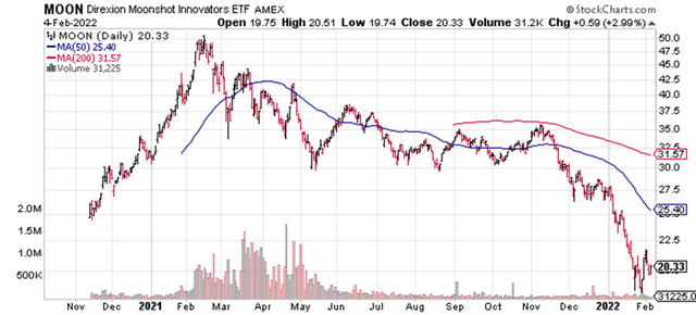 相反,这次我将用Direxion Moonshot Innovators ETF来说明我的观点。自去年以来,MOON已经损失了60%的价值。熊市通常被定义为损失20%或更多。我猜MOON处在一个三重熊市。
