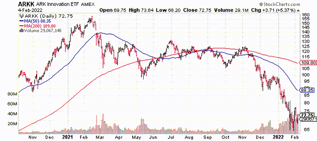我之前的文章谈到了ARKK持续遭受重创的真正原因。尽管这一领域的市场遭受重创,但ARKK最近已经显示出一些复苏的迹象。ARKK最近一直在寻找底部,甚至出现了一些大的上涨。