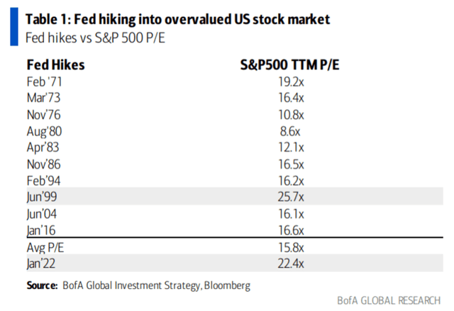 从上面的数据可以看出,在一轮加息周期开始时,标准普尔500指数的平均本益比为15.8倍。我们目前的市盈率是22.4倍。唯一一次本益比较高的利率周期始于1999年年中,当时本益比为25.7。