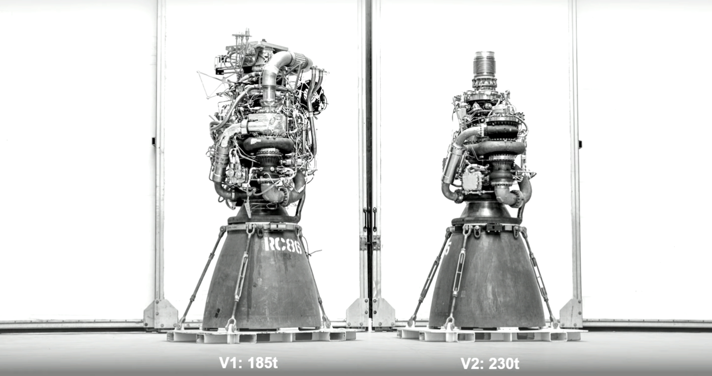 猛禽发动机的最新版本V2(右),比之前的V1版本(左),推力更大设计更简洁