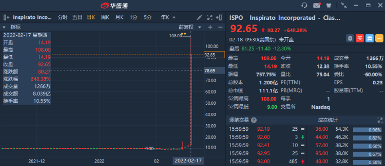 值得一提的是,昨日, $ISPO 开盘报14.19美元,盘中不断异动冲高,多次触发熔断,股价最高上涨到108美元,并最终收涨近650%于92.65美元,公司市值突破110亿美元。