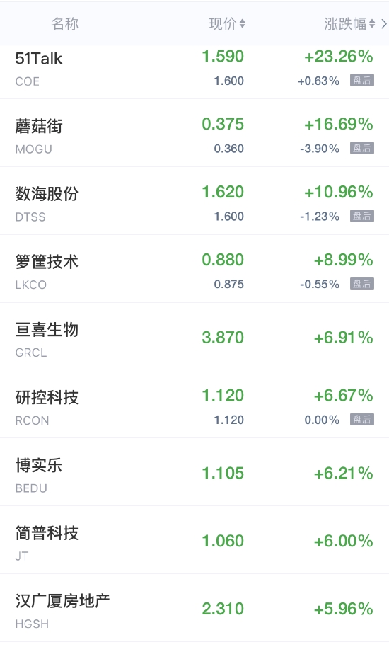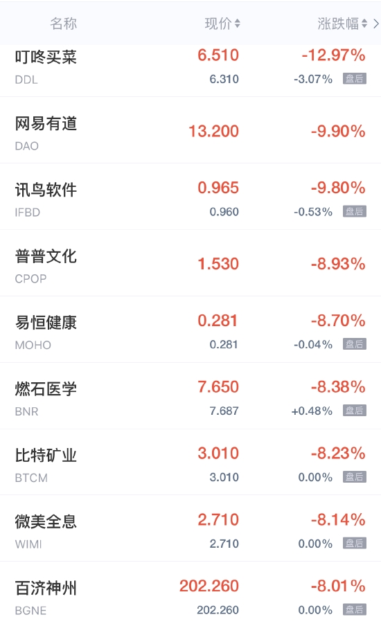 叮咚买菜跌近13%,网易有道、讯鸟软件跌近10%,普普文化跌近9%,瑞幸粉单、比特矿业、微美全息跌超8%,趣头条、好未来跌超7%,贝壳、第九城市跌超6%,爱奇艺跌近6%,拼多多、欢聚集团、流利说跌超5%,新东方跌5%,网易跌超4%,中网载线、世纪互联跌近4%,哔哩哔哩、虎牙、京东、汽车之家、优信跌超3%,知乎跌近3%,百度、金山云、携程跌超2%,腾讯ADR跌近2%,高途、唯品会跌超1%。