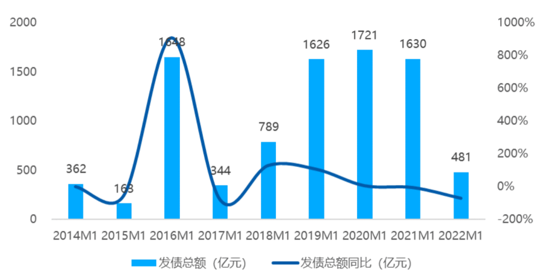 2014年1月至2022年1月房企债券融资规模