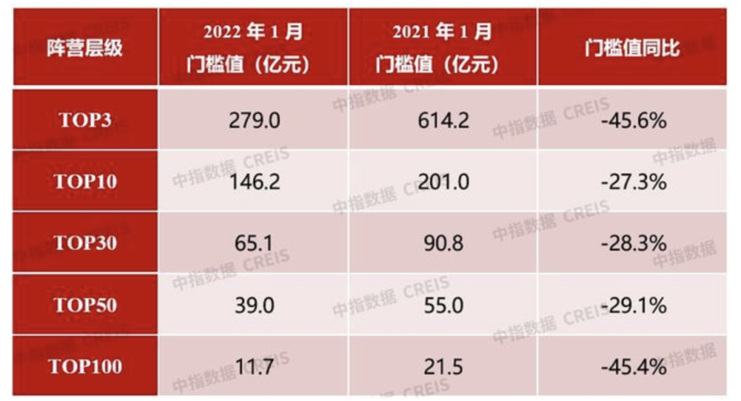 各阵营增长率全部下滑、门槛值次第下滑,百亿房企数量比去年同期减少近一半。