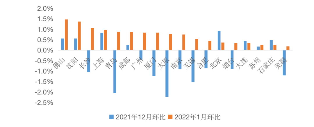 北京、上海、佛山、苏州等城市,贝壳二手房价格指数在上月环比止跌后,1月平稳上涨;泉州、长沙、广州、南京、厦门、无锡、合肥等二手房价格指数止跌趋稳。