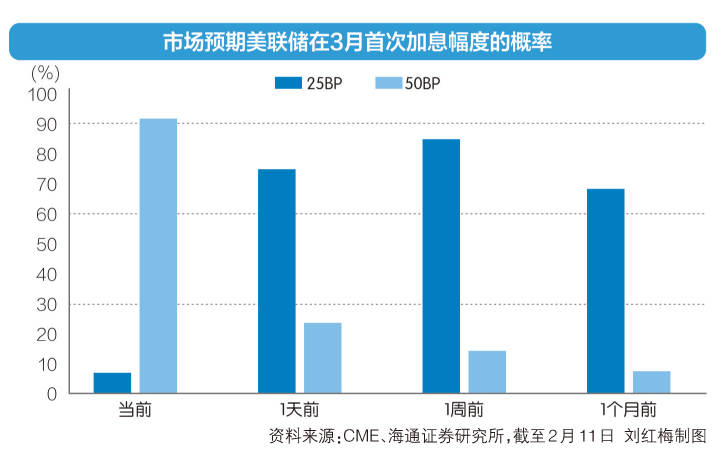 市场因此对未来加息的预期也变得更加激进。据芝加哥商品交易所的数据,1月通胀数据发布后,美联储3月份加息0.5个百分点的可能性从25%升至44.3%;今年加息6次(每次25个基点)的可能性从53%上升至约63%。