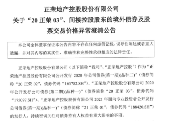 正荣地产控股股份有限公司公告称,近期“20正荣03”、公司间接控股股东正荣地产集团有限公司的股票及发行境外债券价格发生异常波动,出现二级市场成交价格明显偏离合理价值的情况。公司对上述情况进行了自查,截至公告出具日,公司近期经营仍然保持正常状态。
